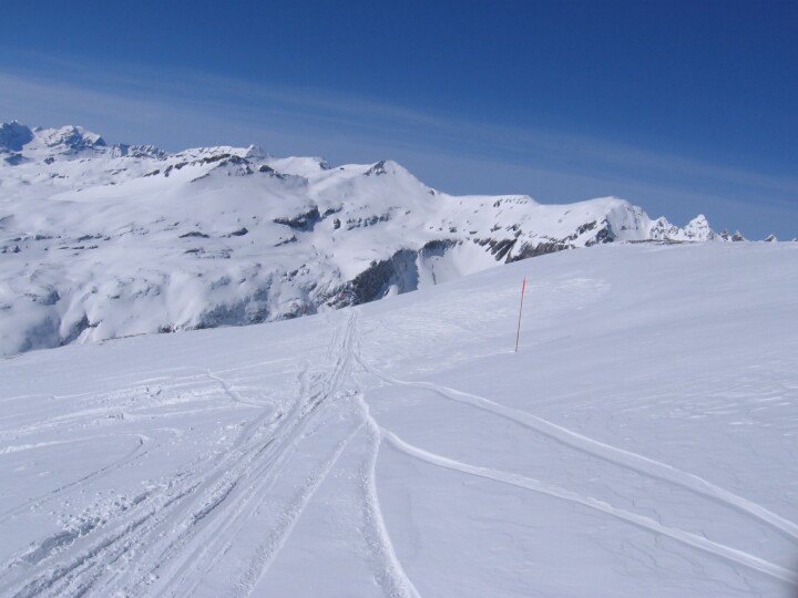 Abfahrtsroute 71 (Segnes), Im Hintergrund erkennt man die Bergstation La Siala mit dem Laaxer Stöckli rechts davon und die Bergstationen der Gletscherlifte mit dem Bündner Vorab links davon.