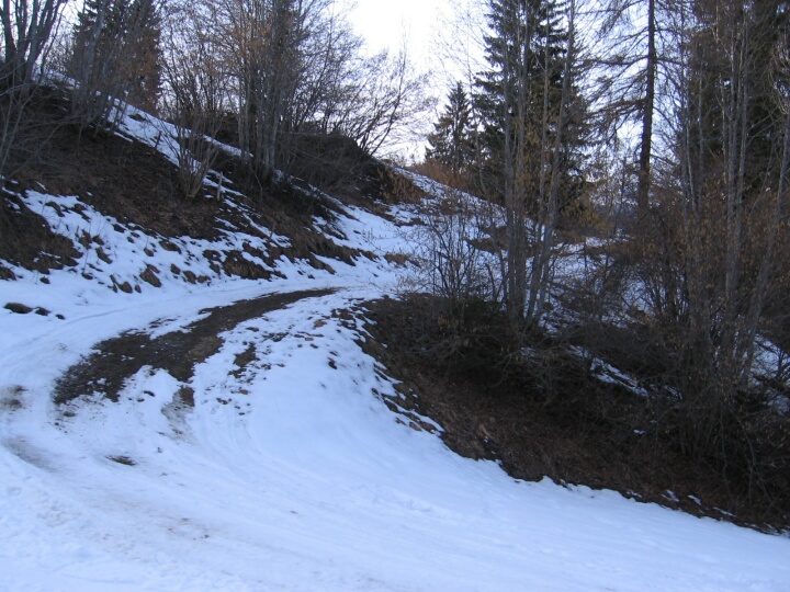Blaue Talabfahrt 6 (Waldhaus) nach Flims Waldhaus, Blick zurück, Ein bisschen mehr Schnee könnte es schon vertragen