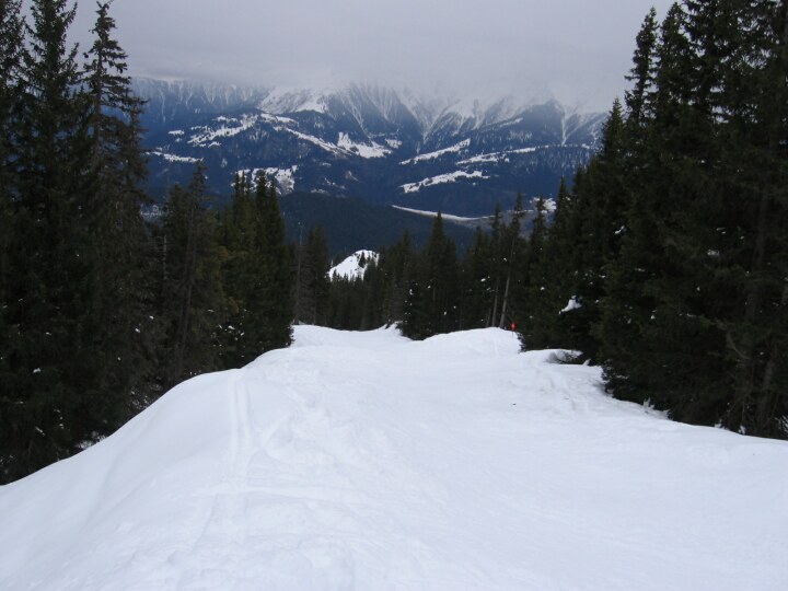 Schwarzen Talabfahrt 18 (Stretg) nach Flims, Hier fängt nun die richtige Abfahrt an. Von der Steilheit eher eine rote Abfahrt, aber recht schmal