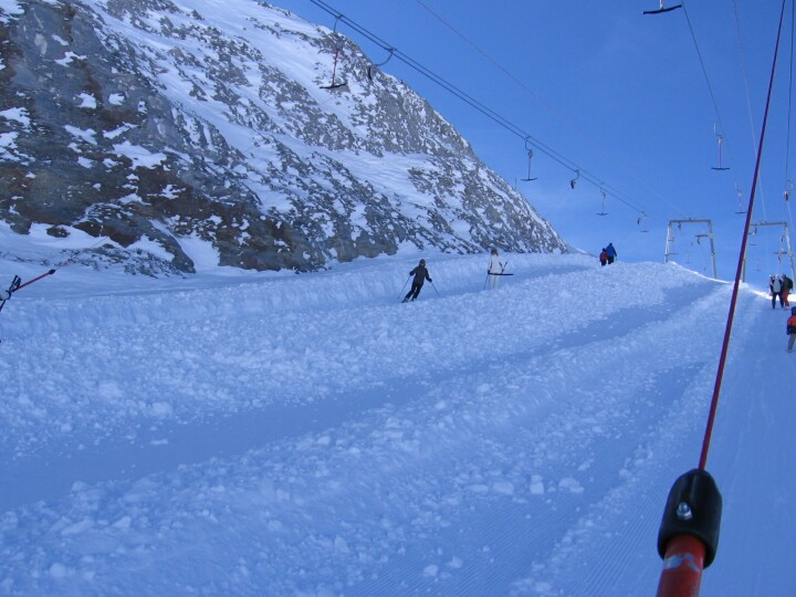 Im 2-SL Vorab Gletscher, Links von den Schleppern ging früher auch mal die blaue Abfahrt auf gleicher Ebene wie die Lifte weiter runter. Heute sind dort nur noch Felsen.